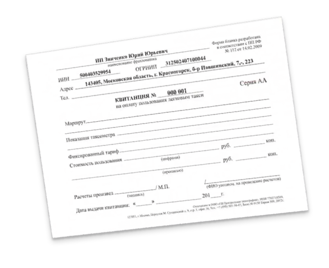 Для легальной работы таксист должен иметь БСО. Квитанция выписывается пассажиру при оплате услуг наличными. Бланки строгой отчетности для такси являются документами, которые впоследствии предъявляются клиентами по месту работы. Благодаря БСО удается нивелировать спорные ситуации с пассажирами при наличном расчете и общении с представителями МАДИ.